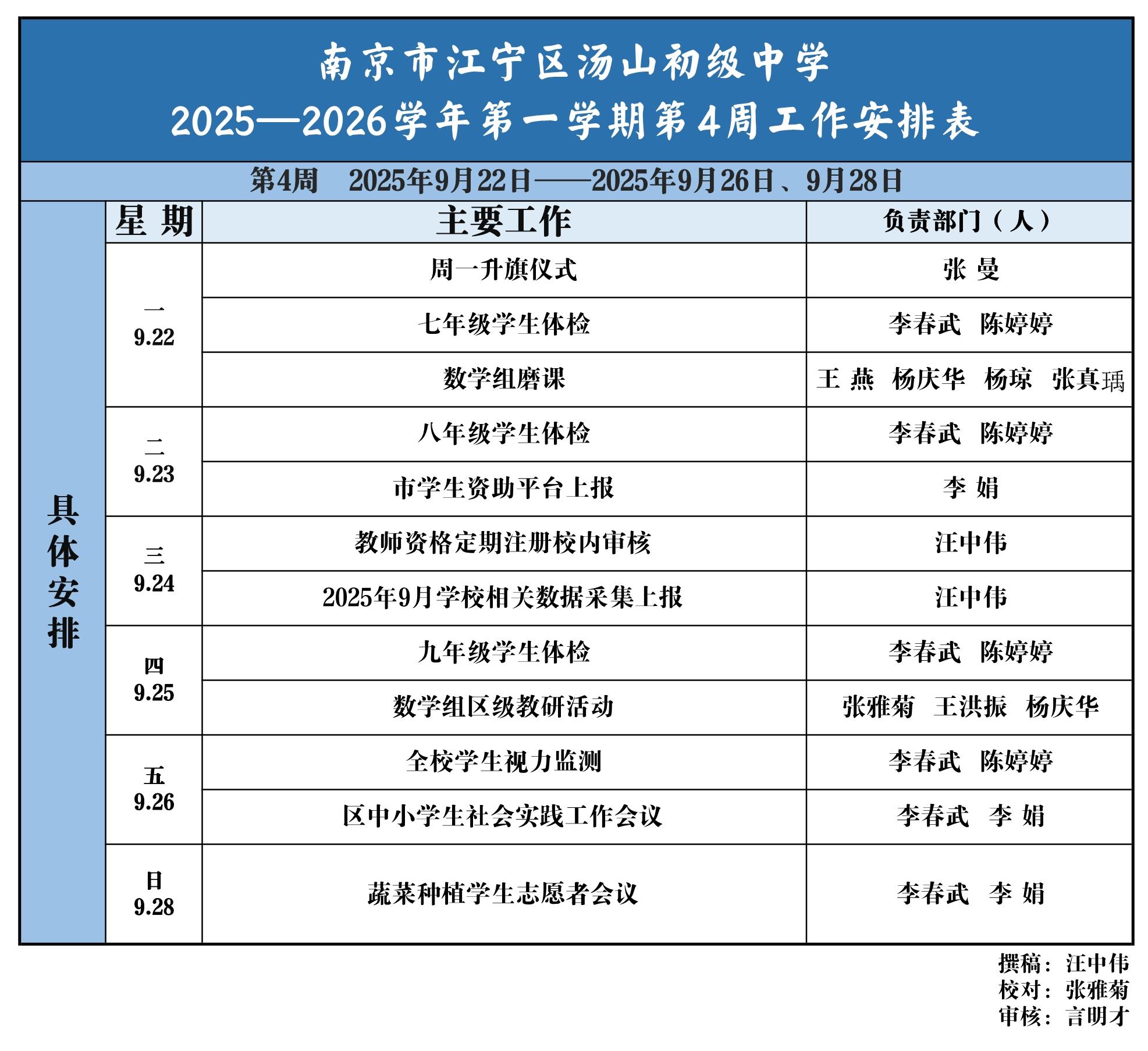 汤山中学2025-2026年度第一学期第4周工作安排