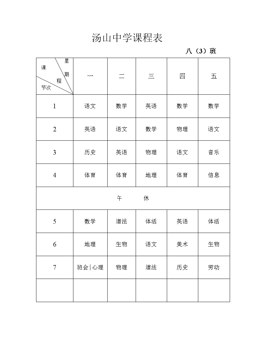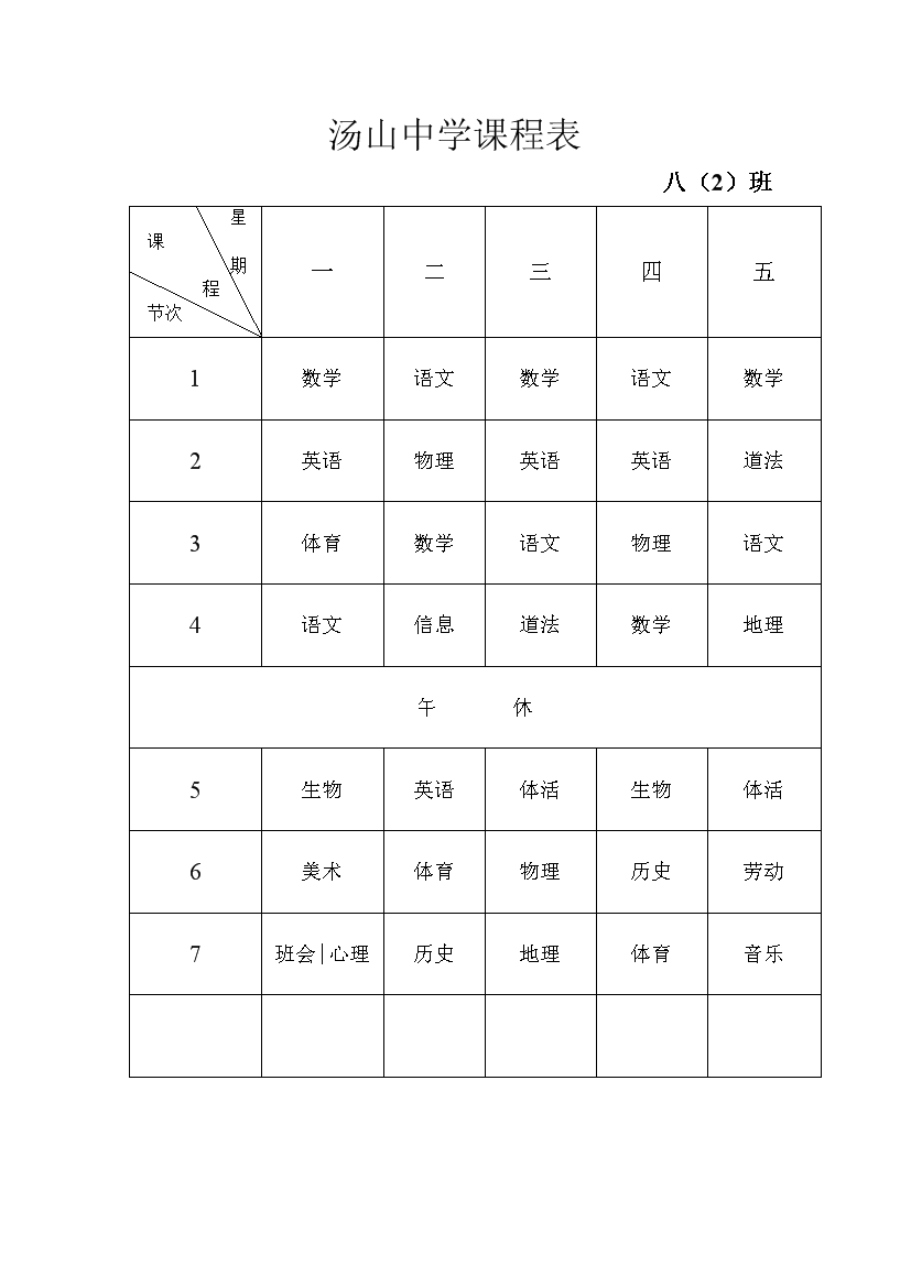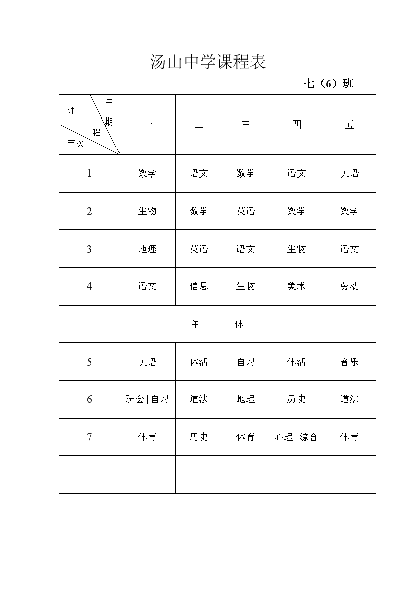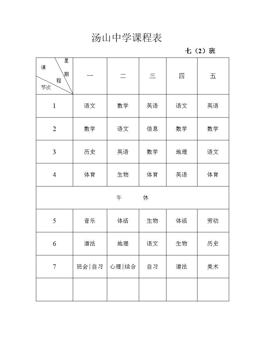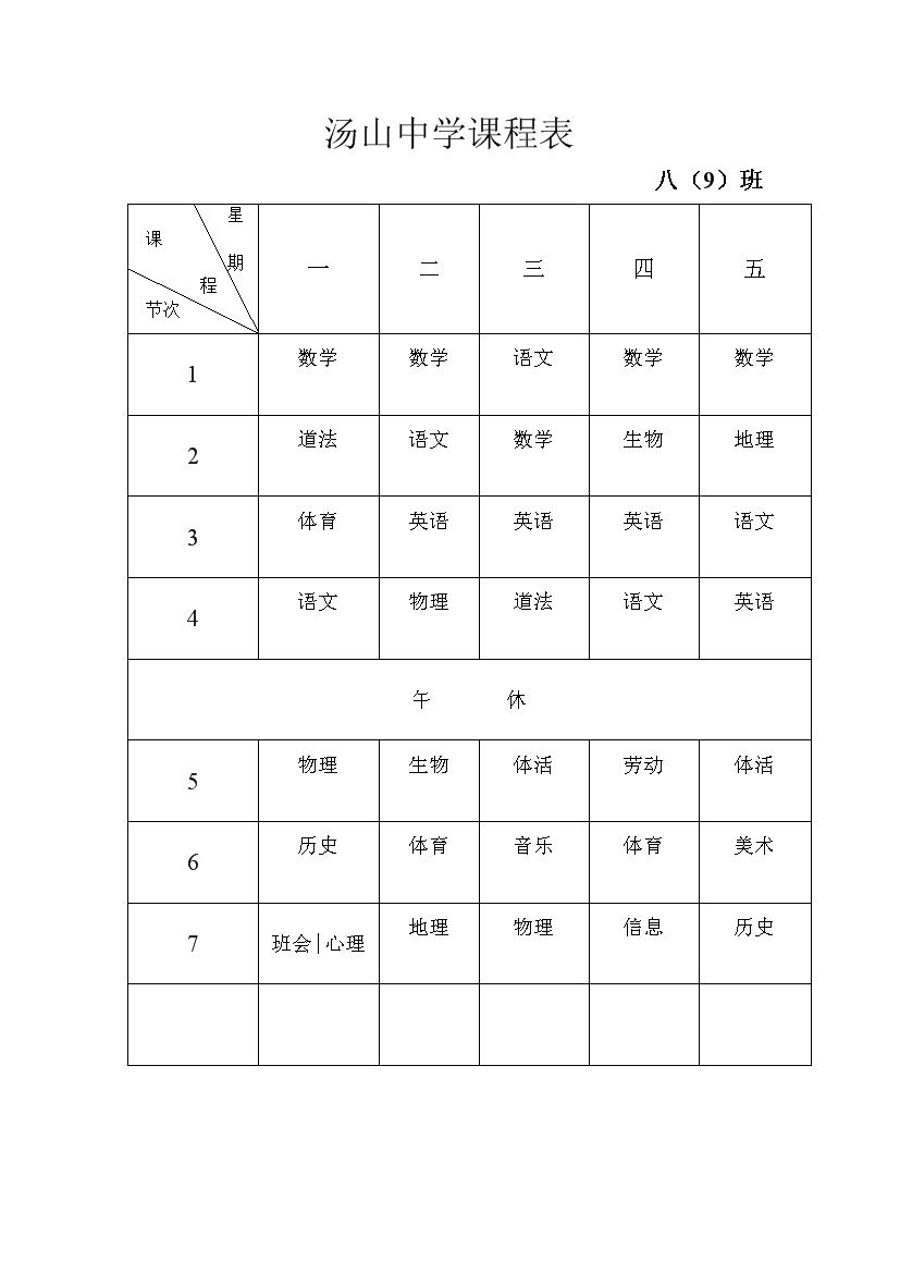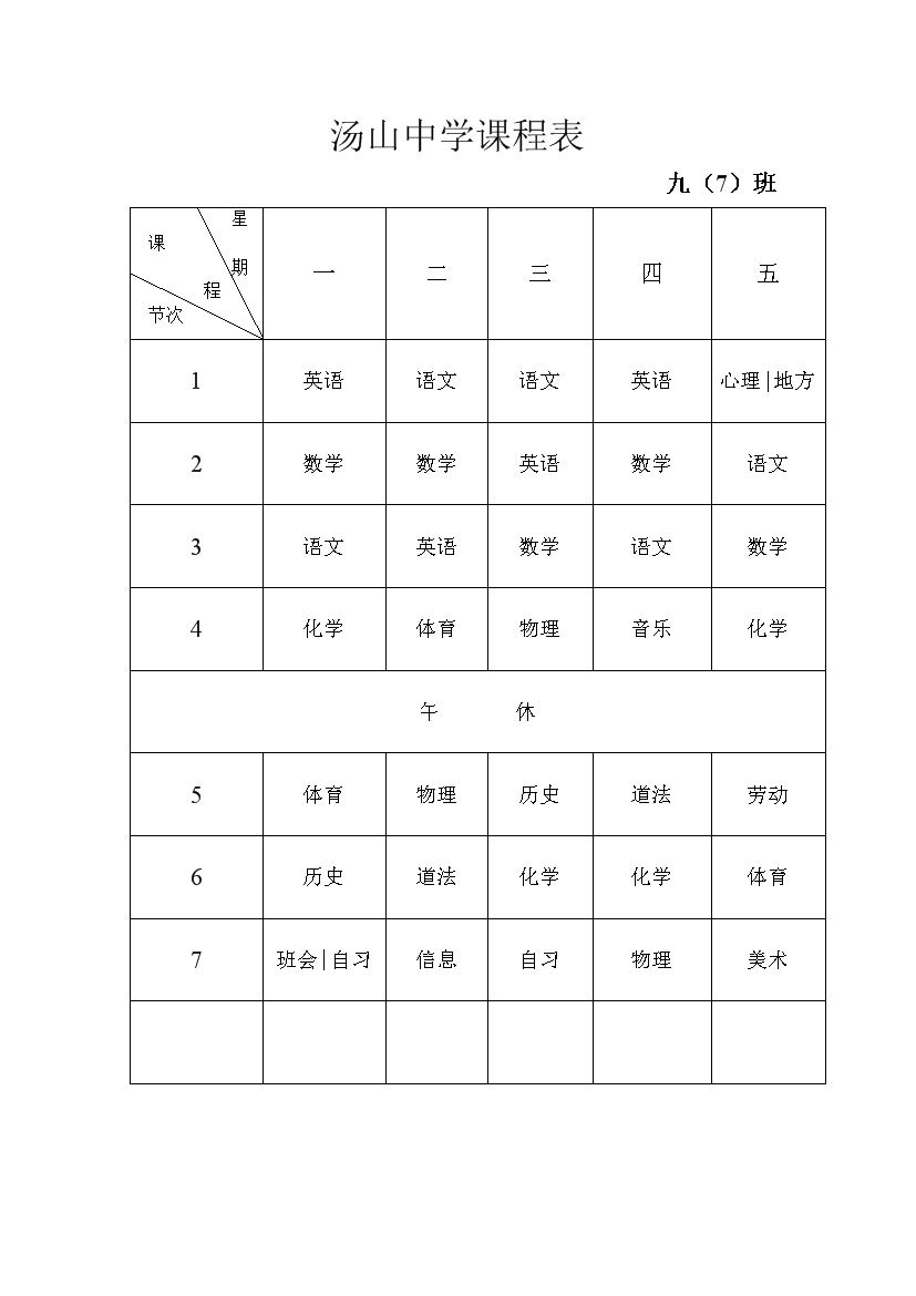 2025-2026学年汤山中学课程表