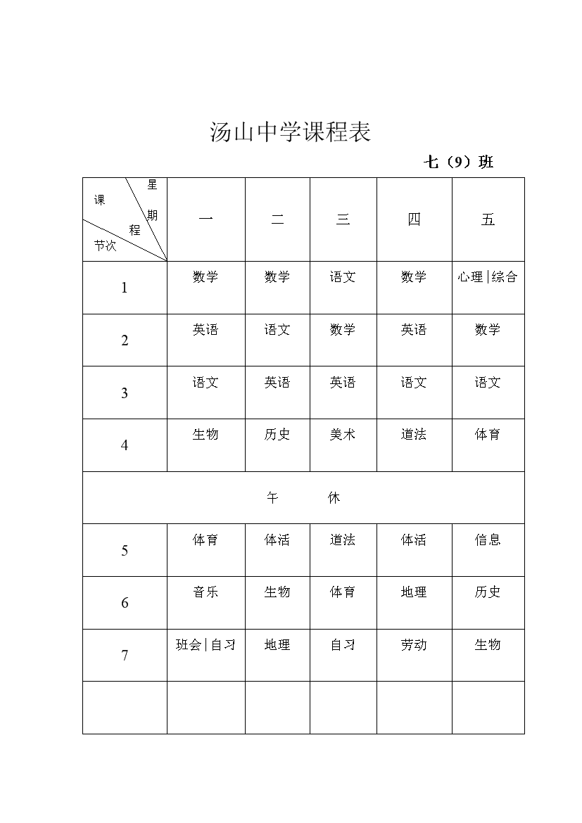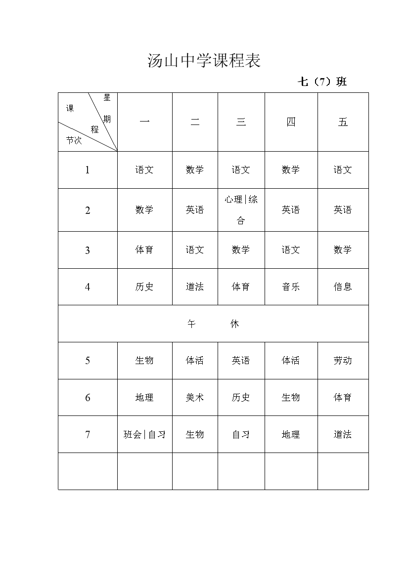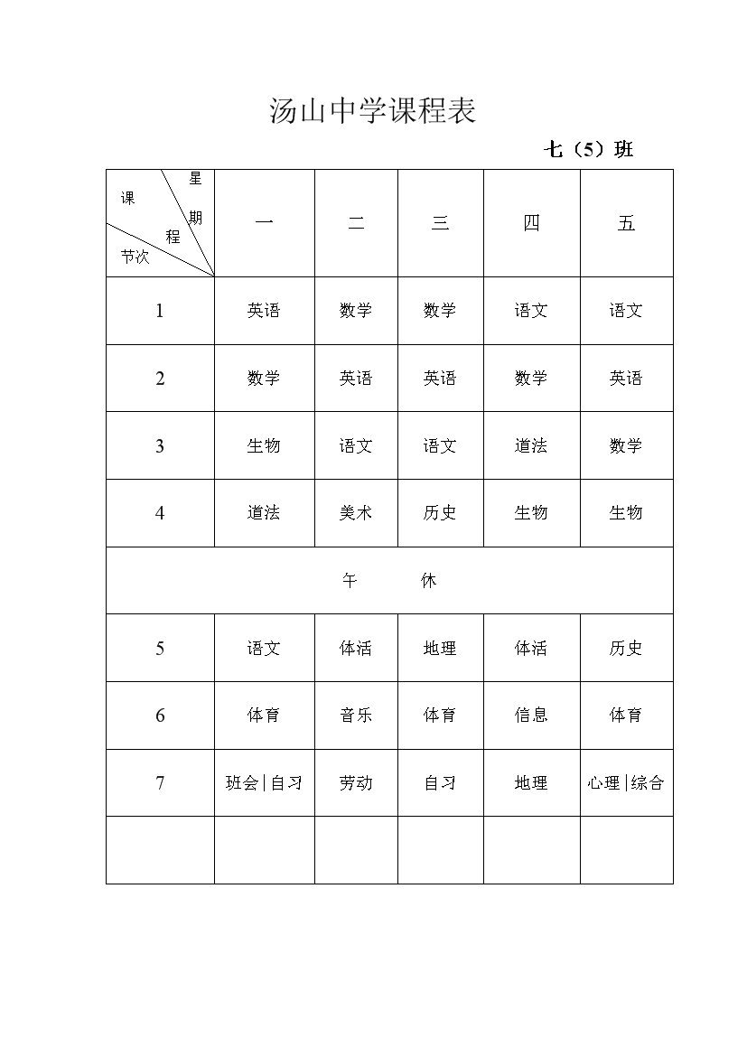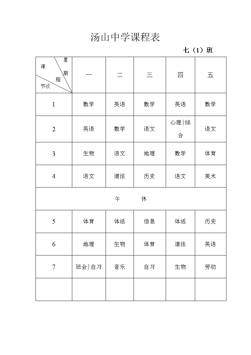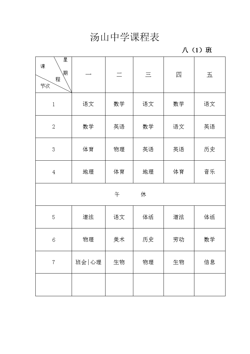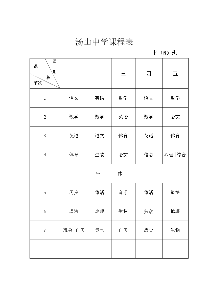 2025-2026学年汤山中学课程表